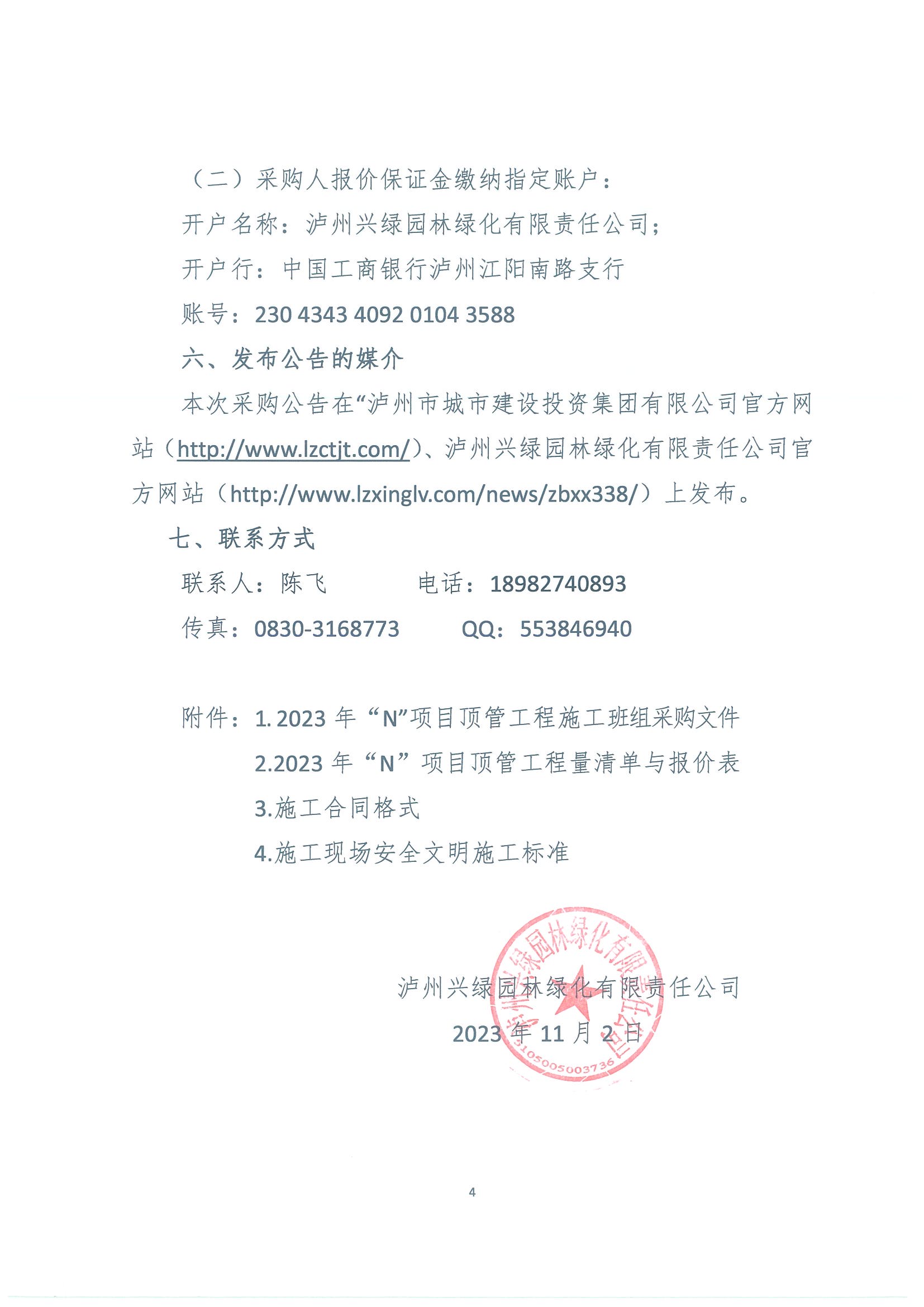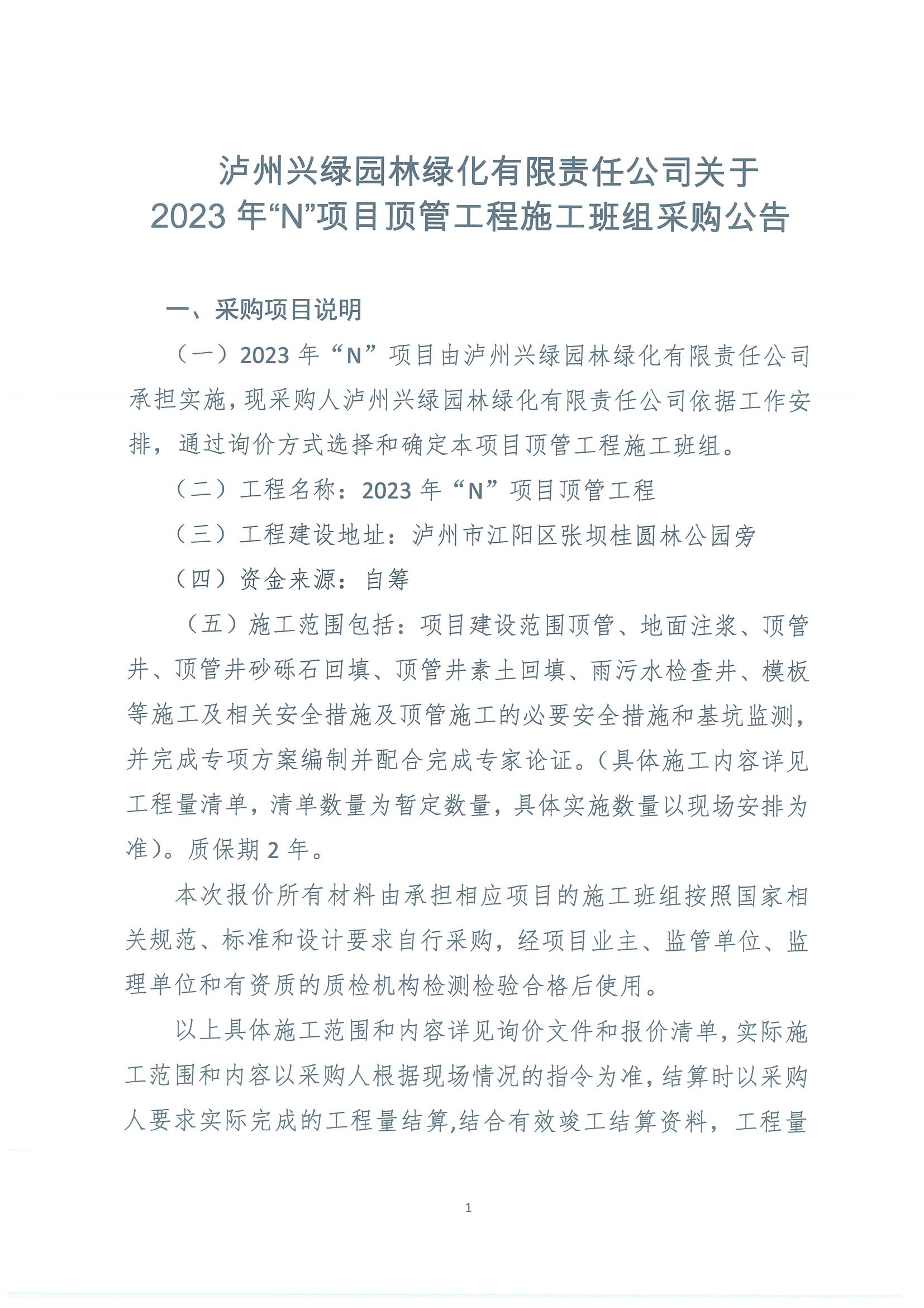 (一)2023年“N”項(xiàng)目由瀘州興綠園林綠化有限責(zé)任公司承擔(dān)實(shí)施,現(xiàn)采購人瀘州興綠園林綠化有限責(zé)任公司依據(jù)工作安排,通過詢價(jià)方式選擇和確定本項(xiàng)目頂管工程施工班組。