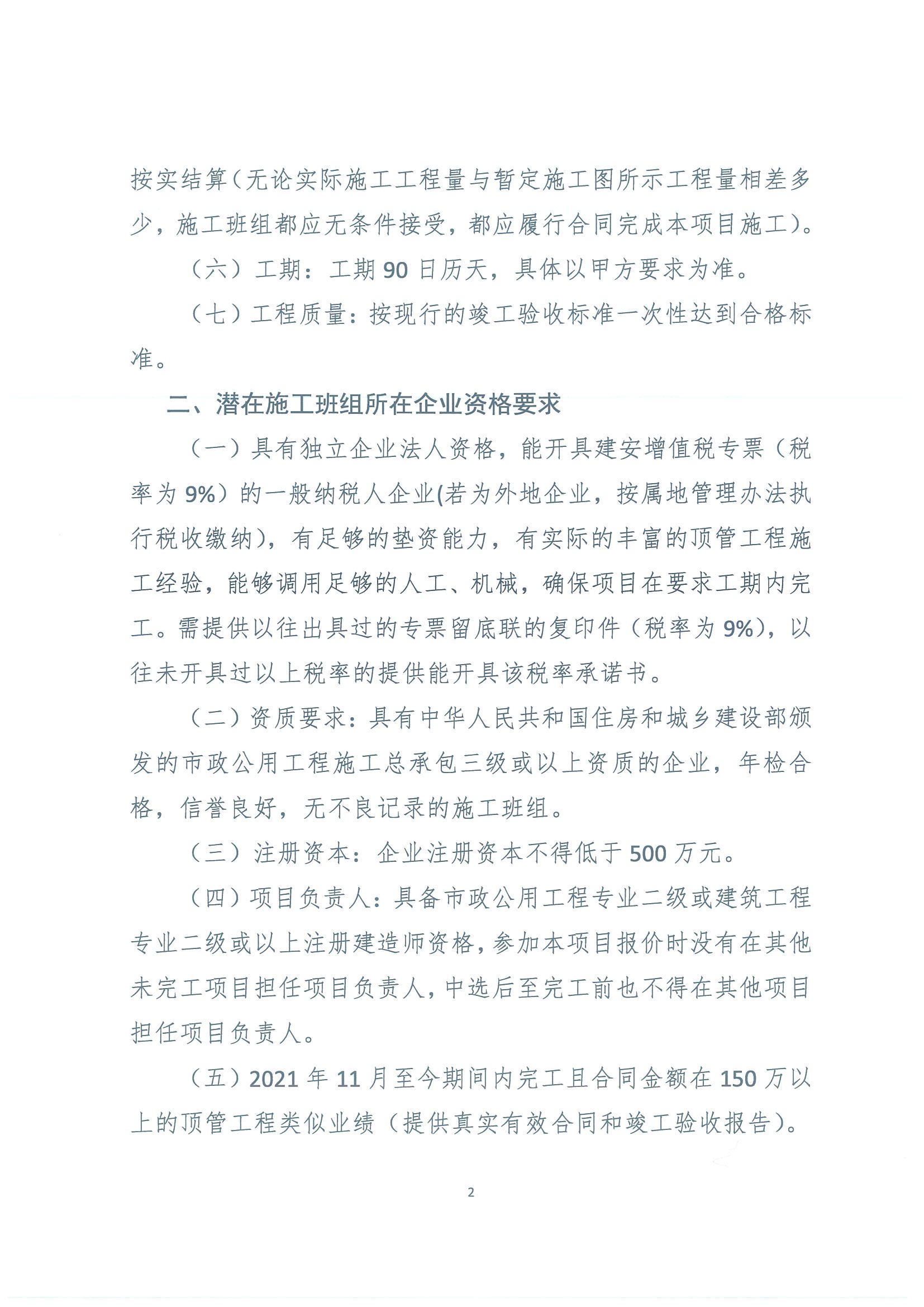 (五)施工范圍包括:項(xiàng)目建設(shè)范圍頂管、地面注漿、頂管井、頂管井砂礫石回填、頂管井素土回填、雨污水檢查井、模板等施工及相關(guān)安全措施及頂管施工的必要安全措施和基坑監(jiān)測,并完成專項(xiàng)方案編制并配合完成專家論證。(具體施工內(nèi)容詳見工程量清單,清單數(shù)量為暫定數(shù)量,具體實(shí)施數(shù)量以現(xiàn)場安排為準(zhǔn))。質(zhì)保期2年。