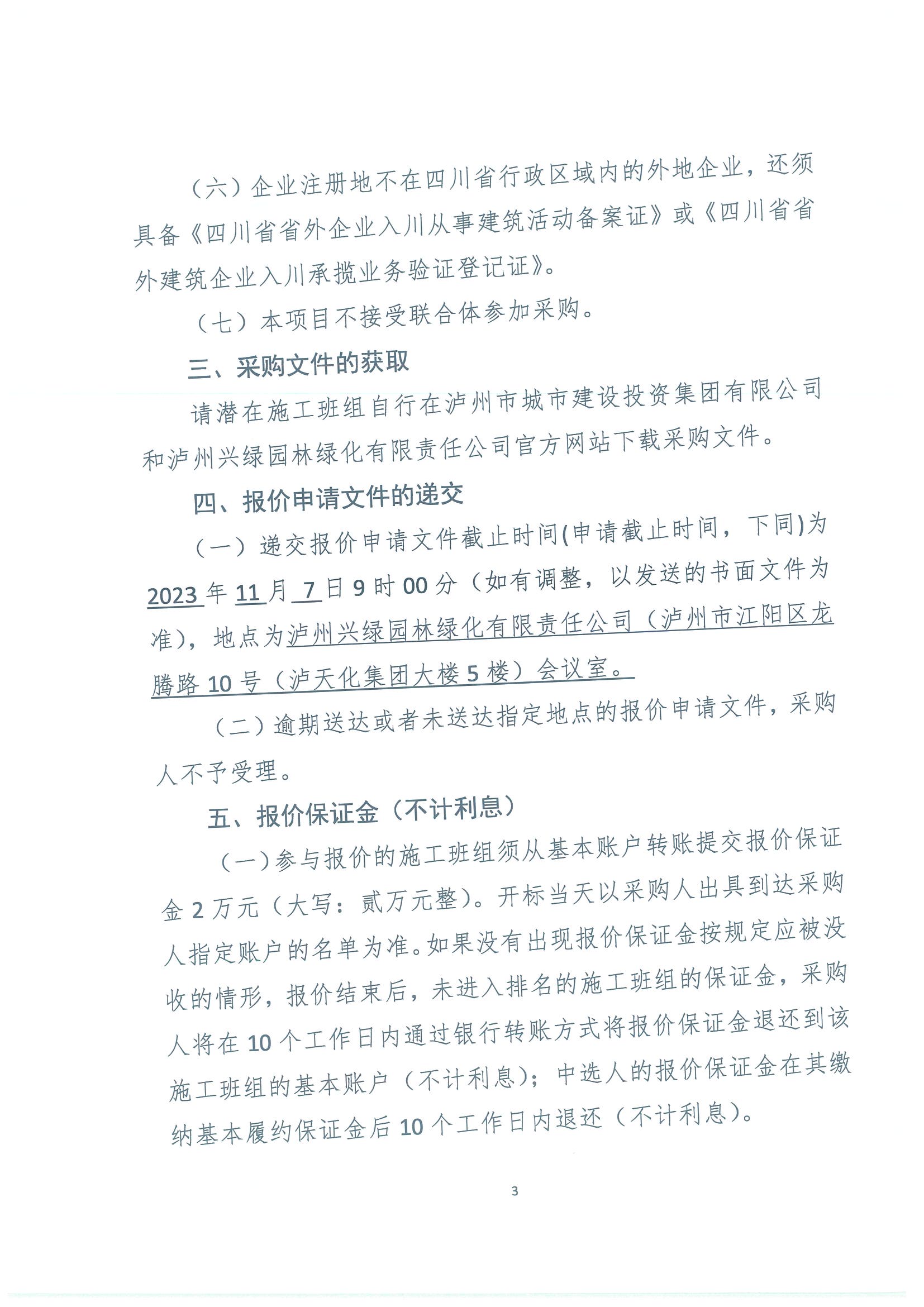 請潛在施工班組自行在瀘州市城市建設(shè)投資集團(tuán)有限公司和瀘州興綠園林綠化有限責(zé)任公司官方網(wǎng)站下載采購文件。
