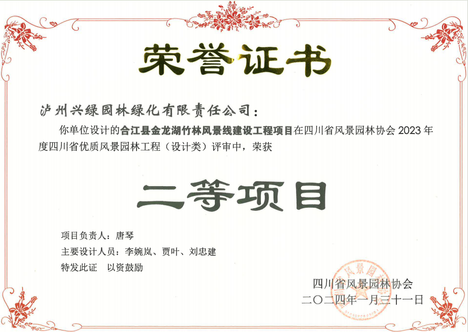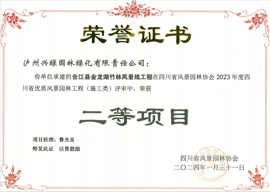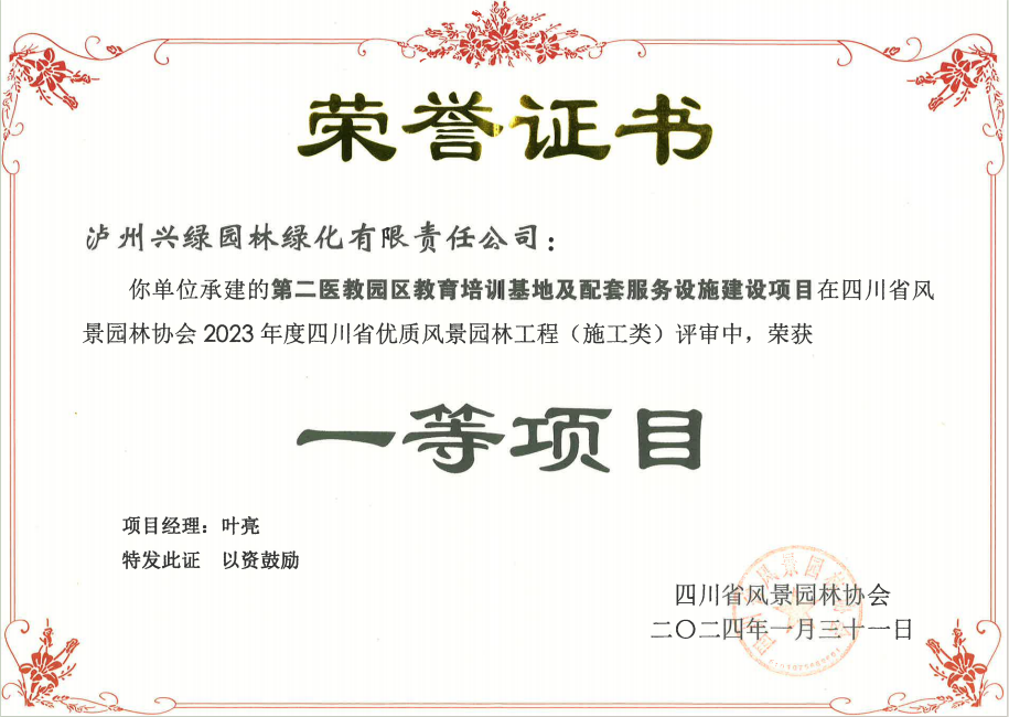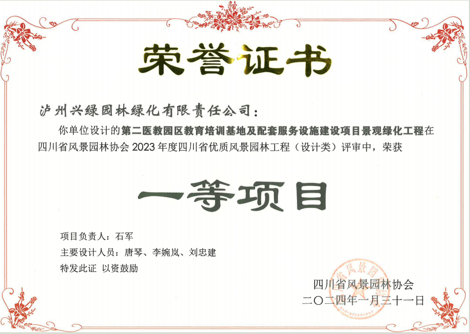 授獎(jiǎng)儀式上興綠園林公司3個(gè)項(xiàng)目喜獲大獎(jiǎng),其中,承建項(xiàng)目“第二醫(yī)教園區(qū)教育培訓(xùn)基地及配套服務(wù)設(shè)施建設(shè)”榮獲2023年度四川省優(yōu)質(zhì)風(fēng)景園林工程施工類一等項(xiàng)目、設(shè)計(jì)類一等項(xiàng)目;“合江縣金龍湖竹林風(fēng)景線工程”榮獲2023年度四川省優(yōu)質(zhì)風(fēng)景園林工程施工類二等項(xiàng)目、設(shè)計(jì)類二等項(xiàng)目;“龍澗溪公園(高鐵片區(qū)段)工程項(xiàng)目一標(biāo)段”榮獲2023年度四川省優(yōu)質(zhì)風(fēng)景園林工程施工類二等項(xiàng)目。
