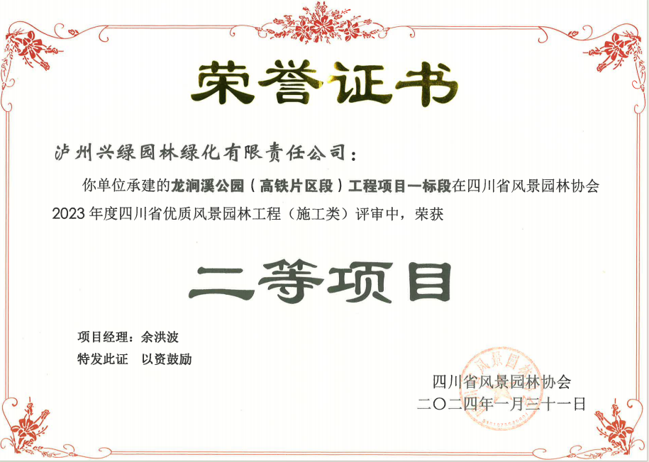 2024年4月19日,由四川省風(fēng)景園林協(xié)會(huì)組織的四川省優(yōu)質(zhì)風(fēng)景園林工程項(xiàng)目授獎(jiǎng)儀式在成都市舉行。